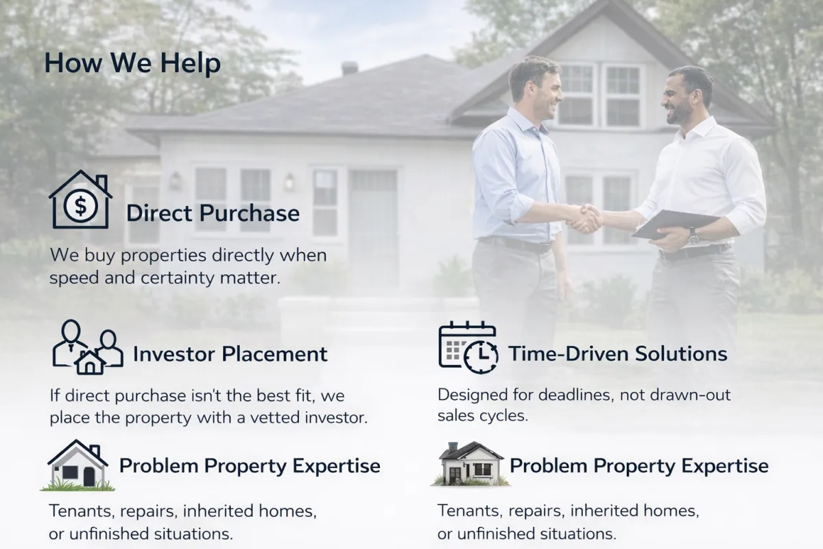 We help homeowners sell quickly and cleanly through direct purchase or trusted investor placement without repairs, showings, or uncertainty.